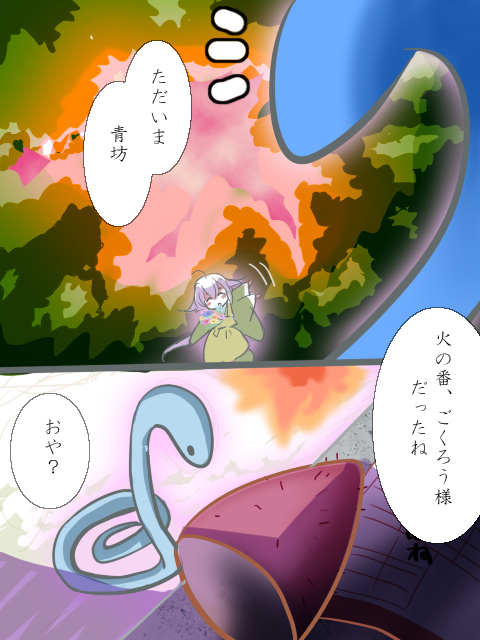 お話の流れでおおのきさんが「旦那もツンデレしてないではやく紫ちゃんを認知するんだ! 婚姻届を塚にお供えしたいのですが場所はどこですか!?」と仰ってくださったので「婚姻届はぜひとも塚の前に置いてやってください!(しかし青坊と赤坊がしれっと焚火の中にほおりこんでいそうですw)」とお返ししたところ、なんとこのような素敵小ネタ漫画になって返ってきました・・!